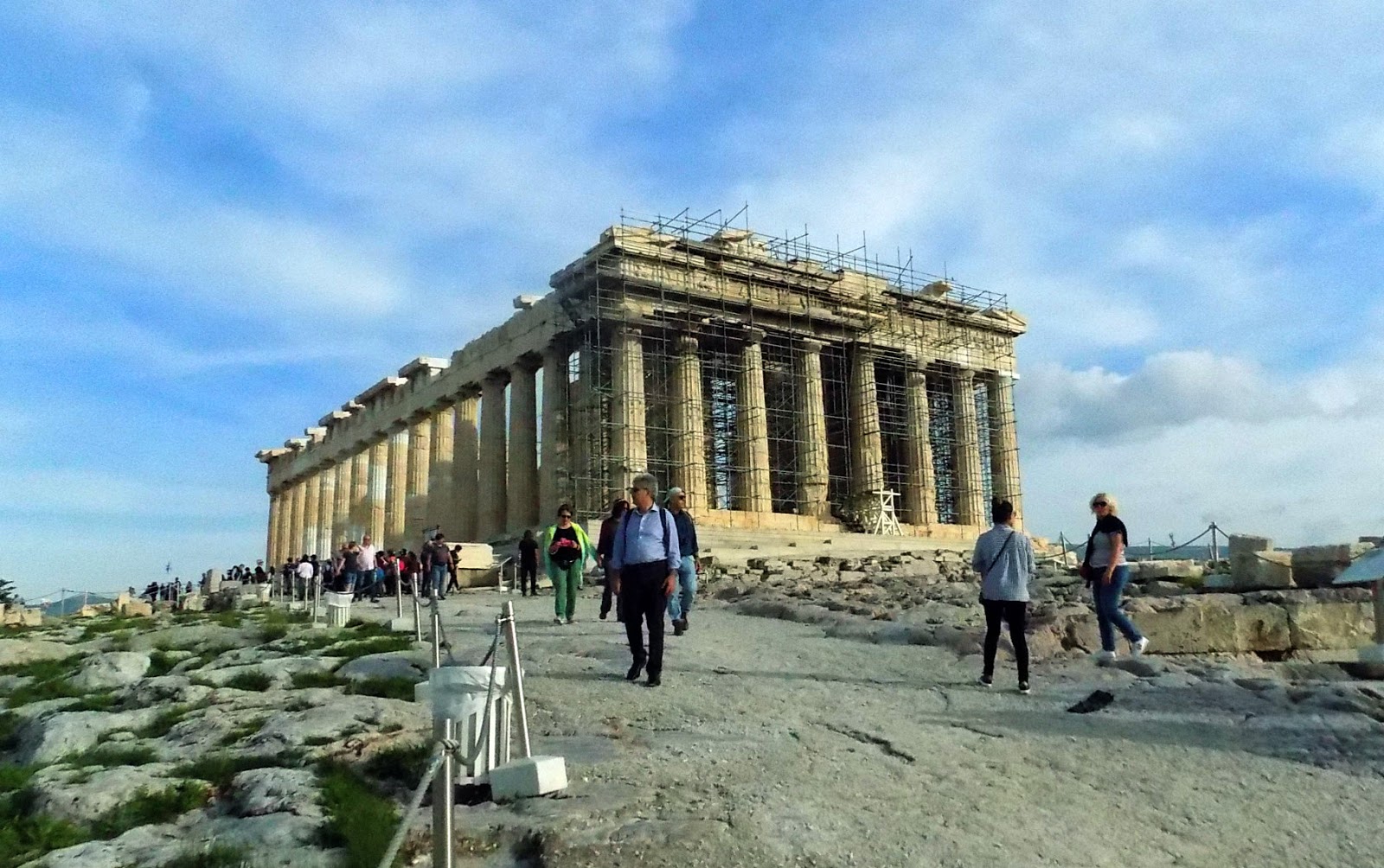 Mivel főszezonon kívül voltunk, olcsóbb volt a belépő, 20 euró helyett csak 10. Természetesen mindent látni akartunk, de csak 2 óránk volt zárásig. Felsétáltunk a lépcsőig, ami a főbejáratot jelentette, és átsétáltunk a kapuk alatt. Elég impozáns látvány volt, ahogy feltárult előttünk a Parthenon. Bár látszik, hogy amennyire lehet, karban van tartva, most is fel volt állványozva, mert a belső templom falait építik újjá, de azért eléggé megviselte az épületet az elmúlt két és fél évezred.