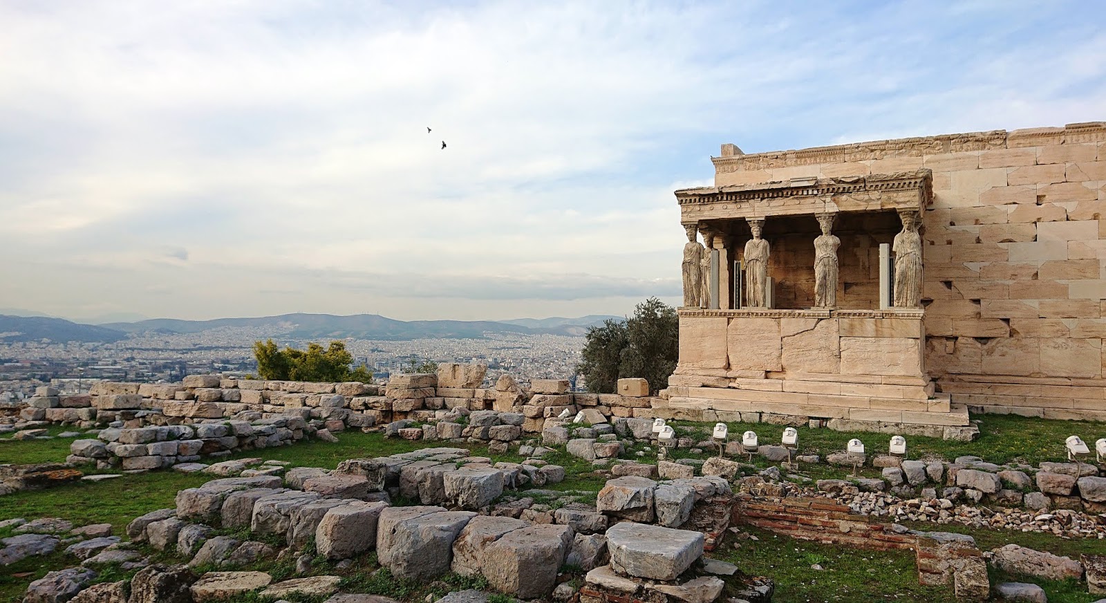 Az Erechteiont, az Akropolisz kultusztemplomát is körbejártuk. Kecses, szép épület. Kicsit sajnálom, hogy a kariatidák szobrait (sose bírom megjegyezni, úgyhogy mindig úgy hivatkozok rájuk, hogy a „lányok”) elvitték, de a légszennyezés kikezdte a szobrok anyagát, az eredetiket az Akropolisz Múzeumban lehet megnézni – kivéve azt az egyet, amit Lord Elgin ellopott, és ma a British Museumban áll.