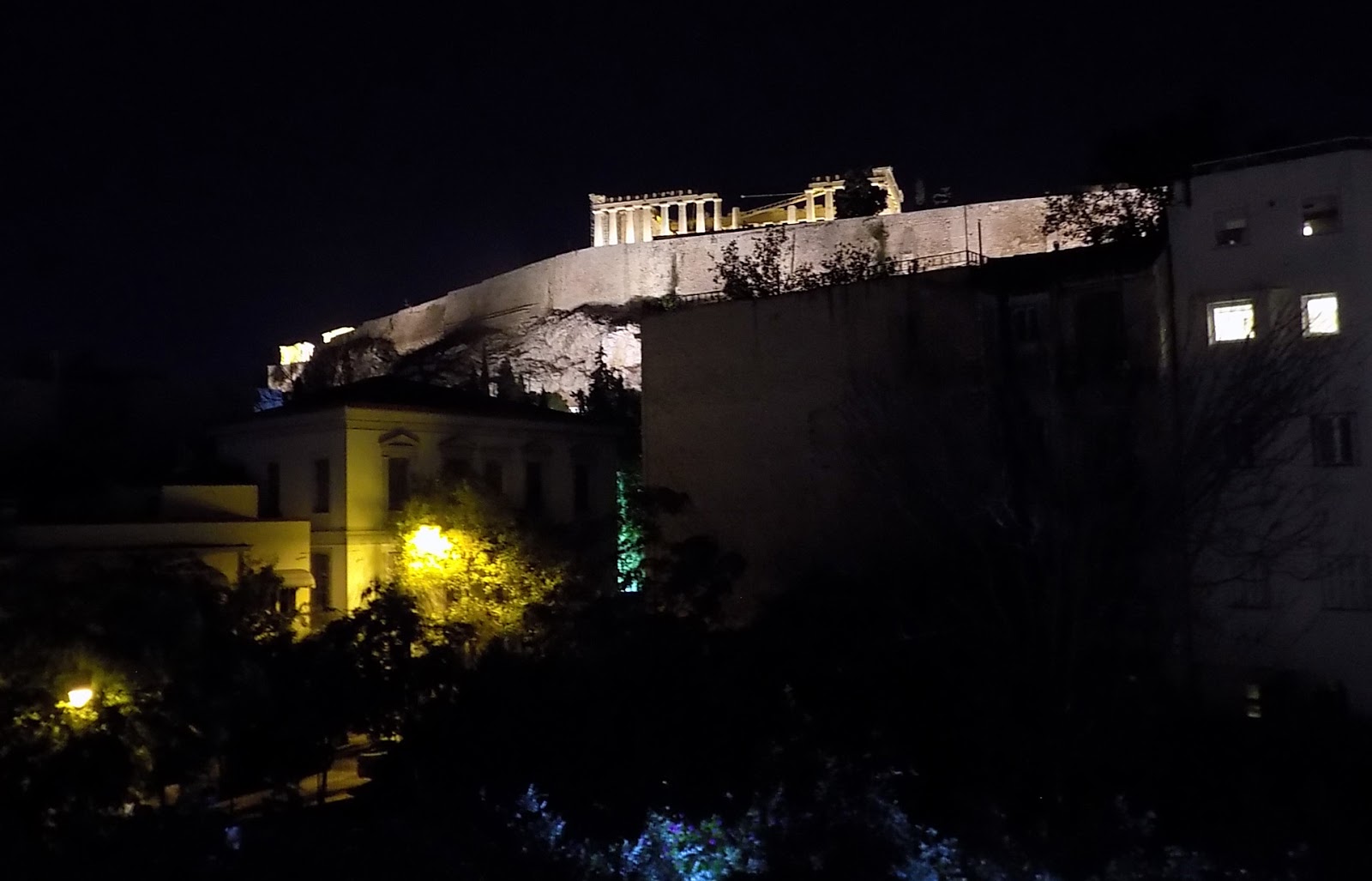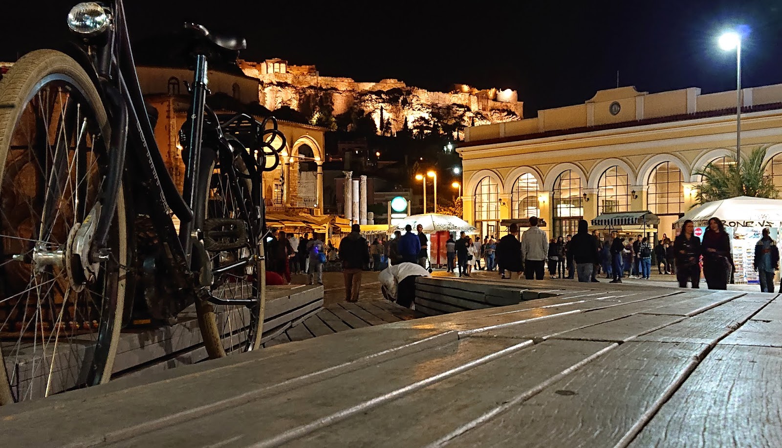 Monastiraki térre. Kicsit szerencsétlenkedtünk, mert a jegyautomata nem adott jegyet, csak blokkot, és a metróból kifelé csippantani kell a jegyet a kijutáshoz, de kijutottunk (én kisétáltam mások mögött, fox az állomásfőnök segítségét kérte). A metróból kiérve az éjszakai fényekben úszó Akropoliszt pillantottuk meg, akkor kicsit leesett az állunk. Késő volt már, ezért a 10 perc sétára fekvő