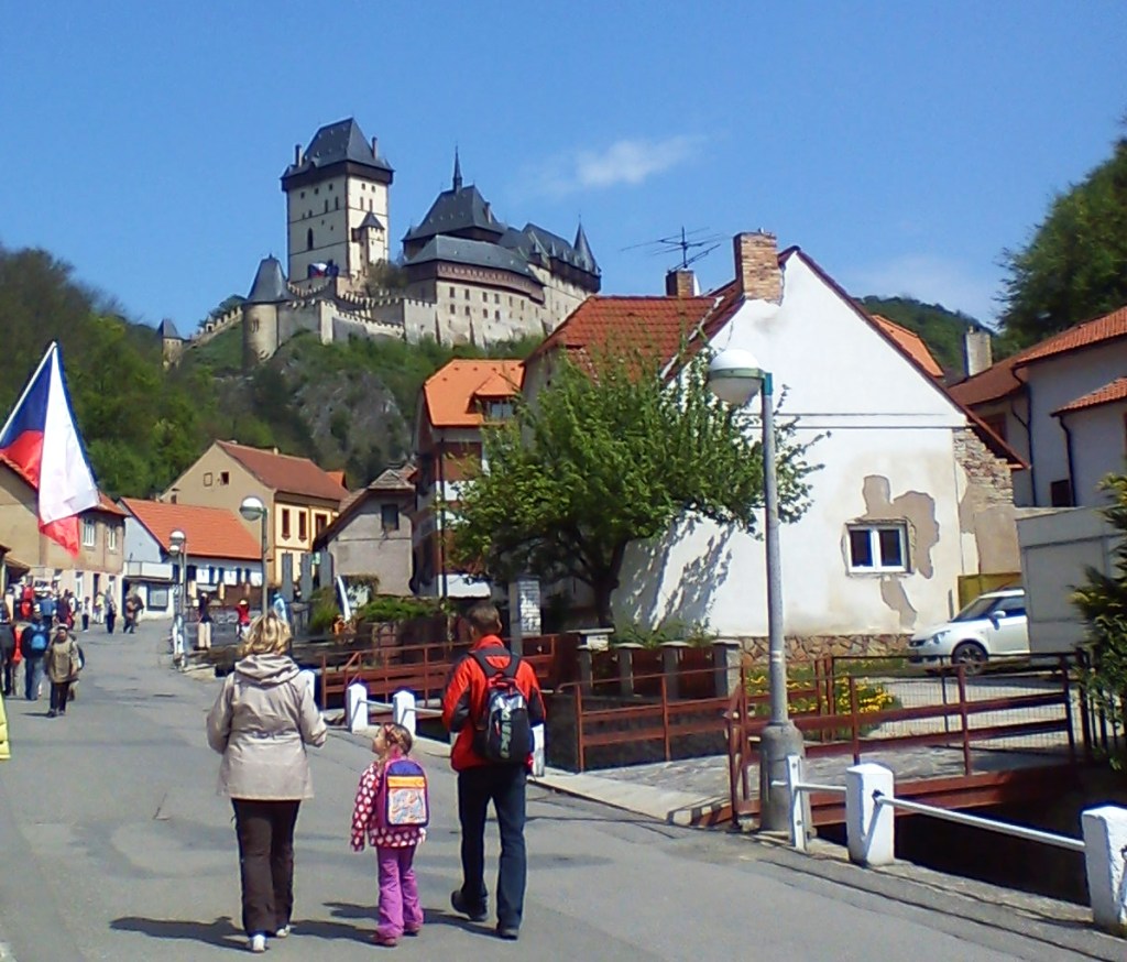 Kisebb bolyongás után eljutottunk a faluba és parkolóhelyet is találtunk. Induláskor Prágában még borult volt az idő, Karlštejnben már sütött a nap.