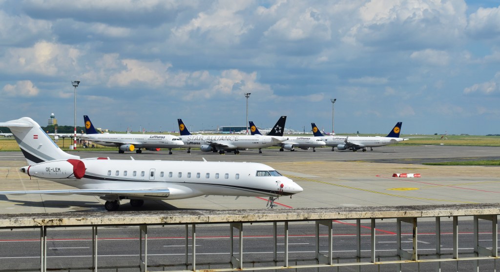 A magángépek mellett a Lufthansa flottájának néhány gépe is itt parkol. A vírushelyzet miatt egy rakás gépet nem tudtak hova tenni, így szétdobták őket európai reptereken.