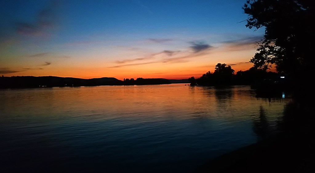 Korábban az is megfordult a fejemben, hogy lemegyek Zebegénybe hamarabb, és megmártózom a Dunában a szabadstrandon. Nem kicsit lepődtem meg, amikor lesétáltam a vízhez, és azzal szembesültem, hogy a Duna konkrétan befalta a partszakaszt, a strandból semmi nincs, csak a mögötte levő kőfal. A naplemente végét még éppen sikerült itt elcsípnem.