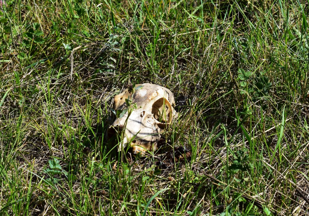 Egy réten jártunk, amikor kisebb állati koponyába botlottunk. A kompozíció a koponya mellett a fűben lapuló szintén állattól származó szarcsomóval lett tökéletes. Ha metálbandám lenne, tuti ez lenne a lemezborítónk.