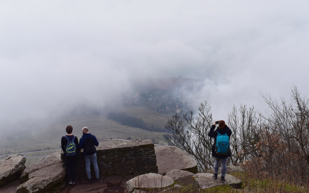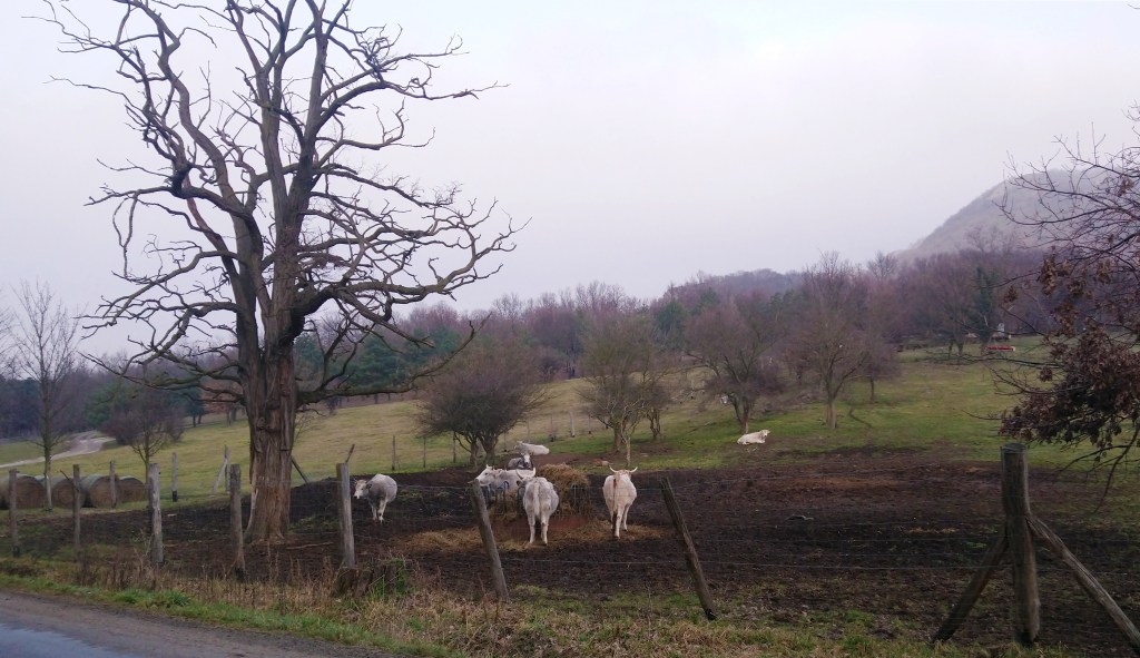 A badacsonyi fennsíkon ködben meneteltünk. Rengeteg kilátópont lett volna, de nem lehetett lelátni a hegyről. Egy alkalommal szakadozott szét éppen annyira a felhő, hogy a Balaton és a parti nádas egy kis szegletét láttuk, de ennyi. Nem is törtük magunkat, hogy a kisebb kitérőt jelentő kilátókat felkeressük, felesleges lett volna.