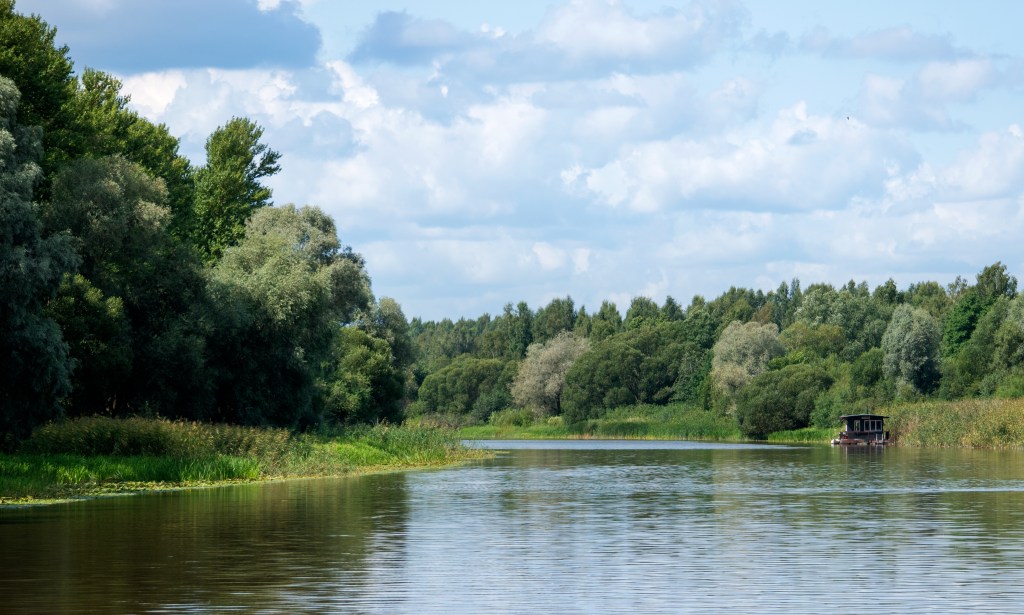 Felszálltunk a kis hajóra, ami lassan megtelt turistákkal. Észak fele indultunk el, szépen lassan átcsorogtunk a belvároson, hidak alatt, elringva a szabadstand mellett. A folyó partján a nádasokon túl kis pihenőházakat láttunk stégekkel, néhol több házikót egy kupacon. A legizgalmasabb egy régi hajóroncs volt a parton, azt mindenki jól megnézte.