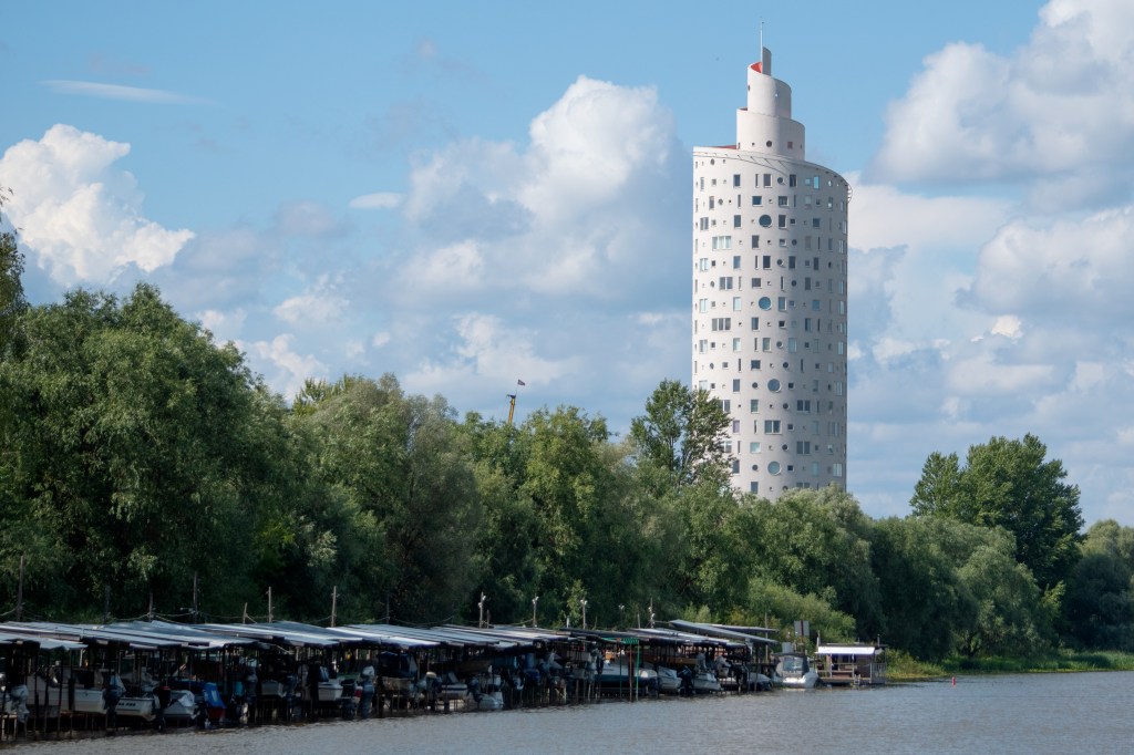 Alig értünk ki a városból, fordultunk is vissza. A kiindulási pontnál nem álltunk meg, mentünk tovább délnek. Itt a fő látványosság a Csigatorony volt, amit végig láttunk az út során. Ebben az irányban inkább az ipari épületek domináltak, illetve ahol újra megfordultunk, ott már amerikai stílusú modern nyaralóházakat láttunk.