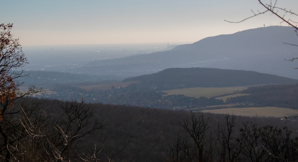 Eddig ezen az úton csak lefelé jöttünk, és mindig reménykedtem, hogy sose kell az ellenkező irányból mennem. Hát nem volt egy kellemes menet felmászni a Kevély-nyeregre, de feljutottunk. Pecsételtünk, aztán a pihenőhely szélén, egy emléktábla alatti padon harmadoltunk el egy részgyőzelmi sört és megtízóraiztunk. A napon egész kellemes volt üldögélni, de hamar elkezdtünk fázni. A látvány is kiváló volt pedig, egyedül az épülő MOL torony torzója rontja el a kilátást. Döbbenetes, hogy ilyen messziről is belerondít a látképbe.