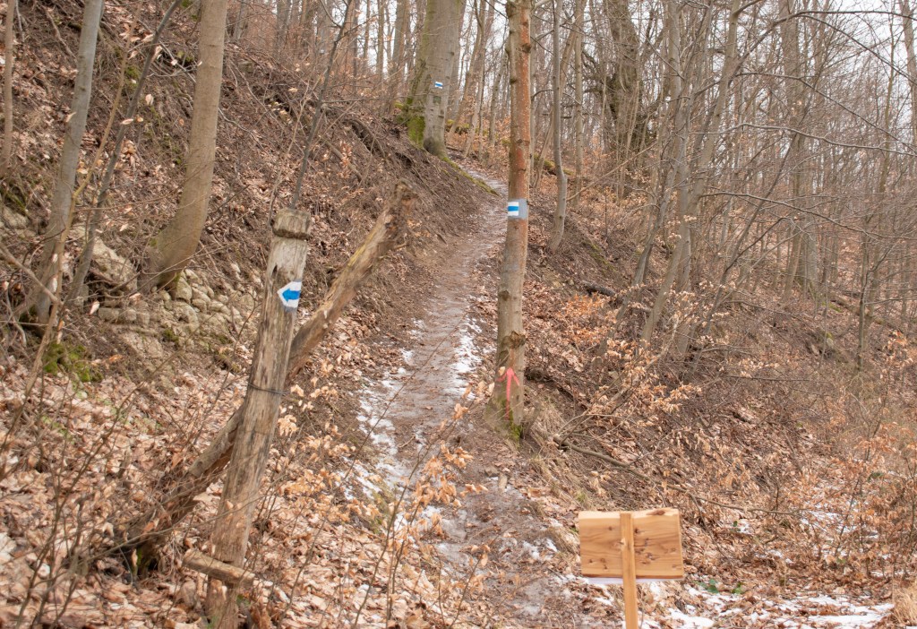 Az erdészház melletti pihenőnél kicsit pihentünk és sütiztünk. Utána széles erdei úton mentünk tovább, ami hamar keskeny ösvénnyé szűkült, és egy meredek hegyoldalban vezetett. Annyira szűk volt, hogy ha jöttek szembe, inkább megálltunk és megvártuk, míg elmennek. A sár miatt néha para volt, de kellő óvatossággal azért járható volt.