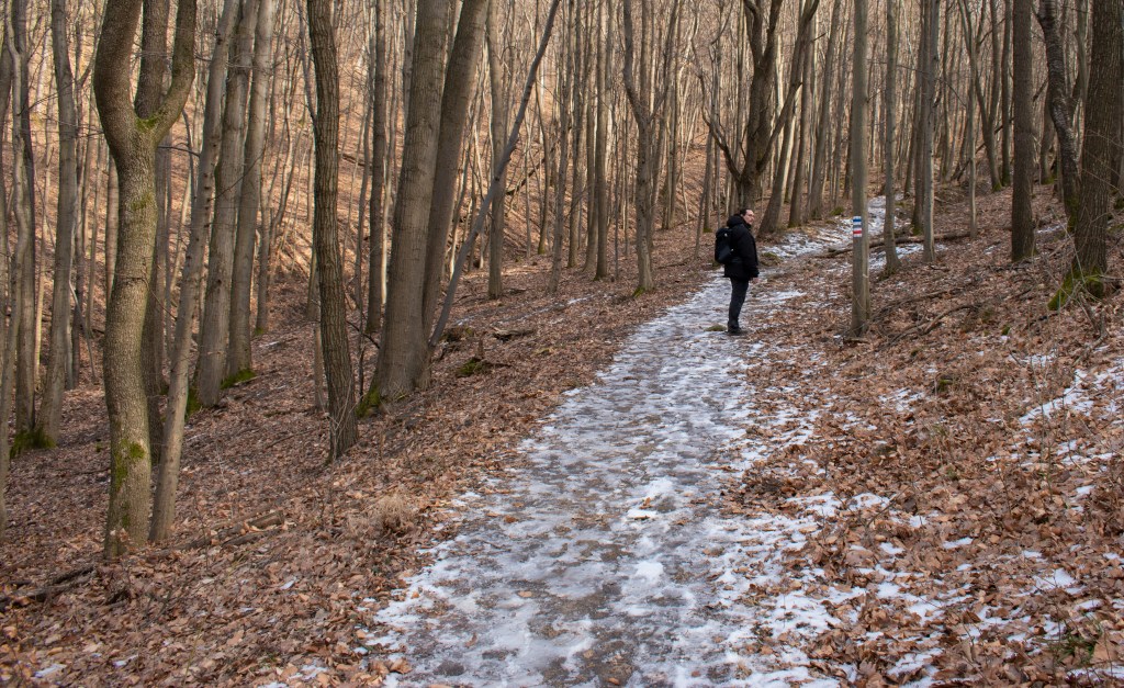 A Vízverés nyerge után jött egy olyan rész, amit megszenvedtem. Egy meredek, keskeny ösvényen kellett leereszkedni egy széles erdészeti útra, de a kis utacska jeges volt.