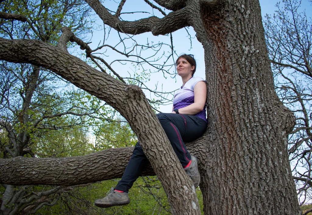 Reggel kicsit hűvös volt még, pulcsiban indultunk neki a Csóványosra vezető útnak, de hamar lekerültek a plusz rétegek. Leereszkedtünk a Nagy-Hideg-hegyről, de nemsokára mászhattunk fel az Égés-tetőre. A tetőn áll egy fa, amin egyszer fotózkodtunk, amikor a kószákkal erre jártunk, ennek örömére felmásztam.