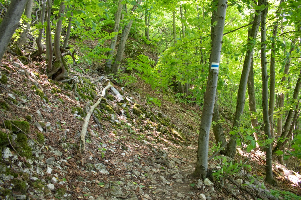 Mikor készen álltunk, elindultunk a nagy mászásra. A látogatóközpont környéke tele volt emberekkel, és meglepetésemre a kéken is rengetegen voltak, de látszott, hogy a többségük kiránduló csak – erre a legjobb szűrő a terephez egyáltalán nem illő ruházat. Egészen a függőhídig volt így, amikor is az igazi mászás kezdődik a Naszályra, onnantól csak néhány túrázóval találkoztunk.