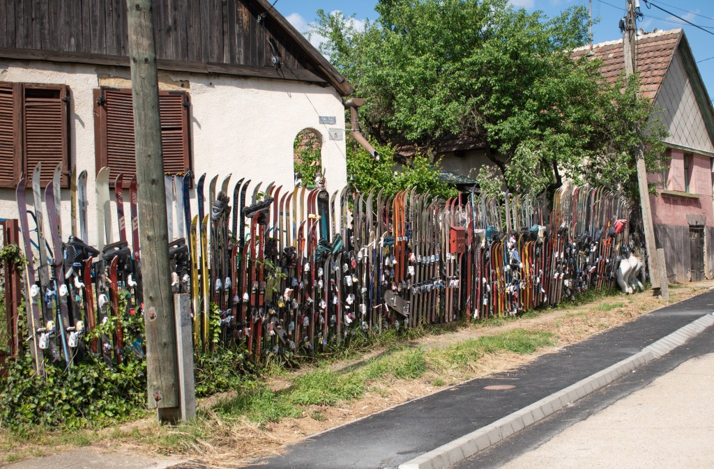 Egy mezőn sétáltunk át Ősagárd felé, és a falutól nem messze már érezni lehetett az akác édes illatát, ami teljesen belengte a környéket. A faluban láttam a kerítést, ami már annyi képen szerepelt, és sílécekből van kirakva.
