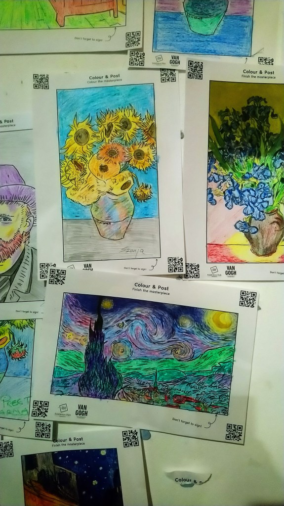 Utána következett egy teljesen agyament, de működő ötletre épülő rajzolós szoba, ahol Van Gogh képeket lehetett kiszínezni, beszkennelni, és nézni, ahogy a vetítő a beszkennelt rajzodat vetítik ki a falra – amíg elég sok más ember is szkennel, és a tiéd lekerül a falról. A rajzokat bluetechkel fel lehetett rakni a falra, ami elég jól nézett ki. Felnőtt embereket tök jól el lehet azzal szórakoztatni, hogy színezzenek, és kvázi fizetnek is érte. 😀 Belegondolva vicces. Ami zavart, hogy zsírkrétákat raktak ki, nem színes ceruzákat, pedig azokkal sokkal szebben ment volna a színezés.