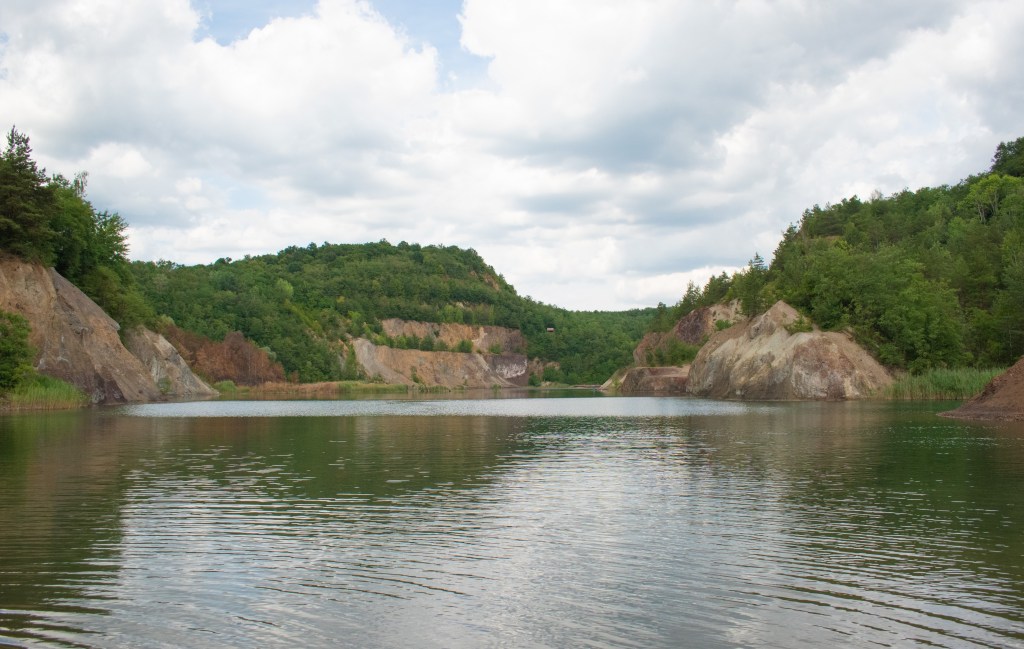 Egykori bányászfalvak során vezetett át az út a mára feltöltődött bányagödör felé. A tó előtti parkolóhoz murvás út vitt, és nem kis meglepetésünkre belépőt kellett fizetni a látványossághoz: igaz, hogy csak 300 Ft/fő, de szokatlan, hogy egy bányatóhoz jegyet kell váltani. Kiépítve semmi nincs, a murvás parkolóban van egy toitoi, ami meglepően tiszta volt. A tóban tilos fürdeni, ezért igyekeztünk nem látványosan vinni a fürdős holmijainkat, aztán láttuk, hogy mások gumimatraccal érkeznek, és a kutyát se zavarta. A tóhoz murvás, köves út vezetett, és fenséges látványt nyújtott, amikor megpillantottuk a fák között. Tényleg mesés.
