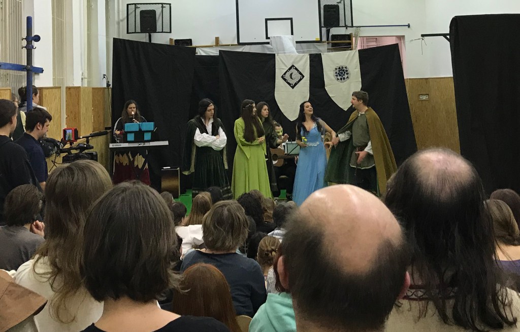 Alig végeztünk az ebéddel és a pénzfelvétellel a plázában, futhattunk vissza a suliba, mert kezdődött a Beren és Lúthien musical. Hatalmas sor állt a tornaterem előtt, ilyet még nem tapasztaltunk. A szervezők székekkel és padokkal rohangáltak, aztán nagy sokára beengedték a közönséget. Eddig mindig a földön ültünk, ami azért volt jó, mert nagyjából azonos magasságban volt mindenki, de most székeket raktak ki a közönségnek. Emiatt aki hátra szorult – mint mi – csak állni tudott, de ha előtted is álltak, akkor esélytelen volt látni bármit is. Végül behoztak nekünk két iskolai padot, azokra ültünk le, de előttünk emberek álltak, szóval nagyon ritkán láttam bármit is. Legtöbbször a mellettem lévő asztalra rakott laptopon néztem a műsort, ott lehetett látni a kamerafelvételt.