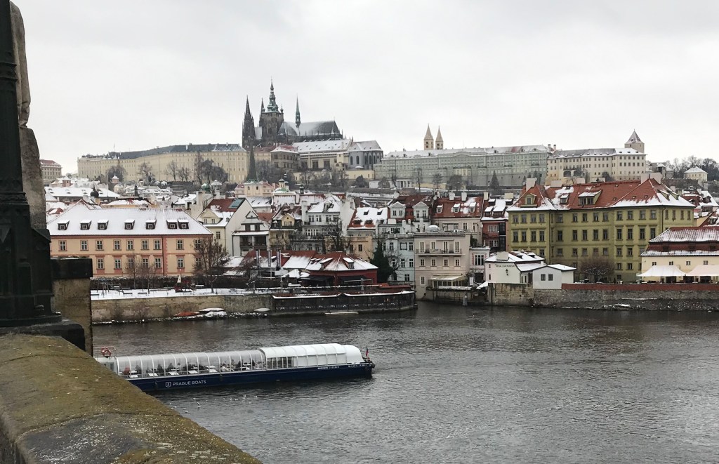 Vonattal mentünk, de nem siettük el az indulást, ugyanis a kicsit későbbi, 9:29-es vonat jóval olcsóbb volt, mint a két órával korábbi, és még korán se kellett kelni. Kényelmes utunk volt Prágáig: két négyes, asztal körüli ülésnél telepedtünk le, ahol a laptopok is elfértek. Egész gyorsan eltelt az út: Lassit tördeltem, ebédeltünk az étkezőkocsiban, beszélgettünk, a többiek is cikket írtak, olvastak vagy éppen dolgoztak. Ahogy haladtunk észak felé, néha havassá vált a táj, de Prágába érve csalódottan szálltam le a vonatról, mert hó az nemigen akadt.