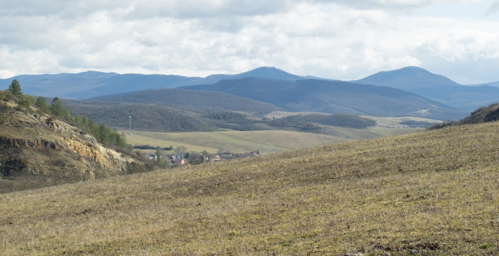 Fújt a szél és hideg volt, a túrát sapka-sál-kesztyű hármasával kezdtük. A faluból kisétálva rögtön egy sáros emelkedővel kezdtünk, kicsit aggasztott, hogy megint végigdagonyázzuk az utat, de szerencsére bár volt sár, meg sem közelítette a korábbiakat. Egy mezőn sétáltunk át a Sámsonházára vivő autóúthoz, a távolban látszottak a Mátra vonulatai.