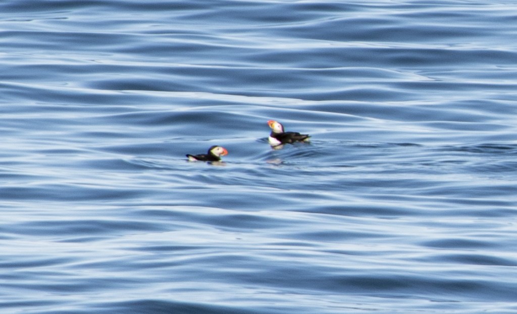 Még egy bálna sem volt még a láthatáron, de én már nagyon boldog voltam, mert ha nem is közelről, de láttam lundákat a vízben! Szerencsére elvittem a teleobjektívemet, és bár szabad szemmel csak apró narancs-fekete-fehér foltokat láttam, a képeken nagyítva egyértelműen lundák úszkáltak a vízben. Repülni is láttam őket, nagyon aranyosak, ahogy a kis szárnyaikkal csapkodnak. (Egyébként nem értem, miért kaptak magyarul ilyen hülye nevet, hogy lunda, az angol puffin szerintem sokkal aranyosabb, és tényleg olyan kis pufik.)