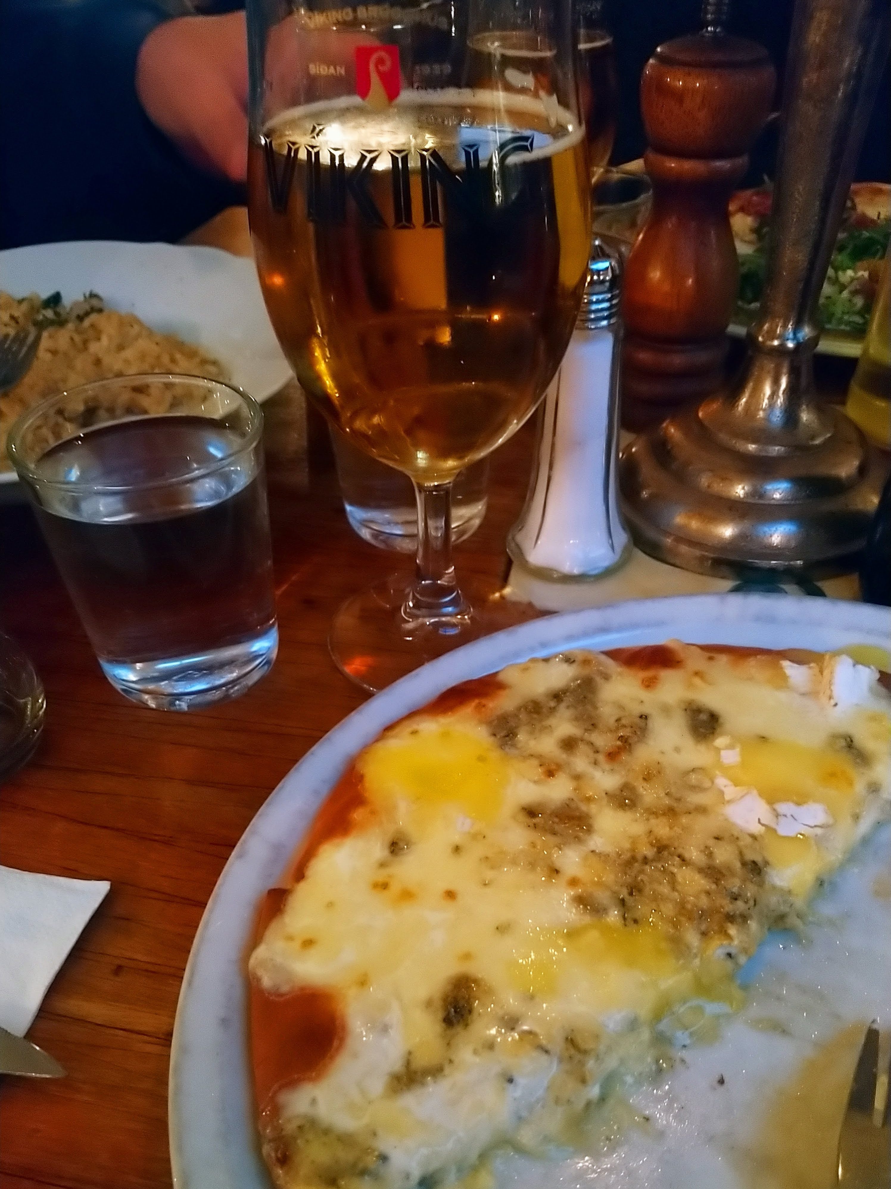 A bálnales után kicsit pihentünk a hotelben, aztán vacsorázni mentünk. A Rossopomodoro olasz étterembe mentünk, mert azt olvastam, hogy minden pizzát és tésztát el tudnak készíteni gluténmentesen is. Kicsit félve léptem be, mert se a honlapon, se az étlapon nem említettek erről semmit, de megerősítette a pincérünk az infót. Sőt, a csapon lévő Víking Gylltur sör is gluténmentes volt. Nem is értem, miért szájhagyomány, illetve ez esetben egy gluténmentes éttermeket összegyűjtő app (Find me GF) útján terjed csak a híre a helynek. A pizzám láthatóan másfajta tésztából készült, mint a gluténos, de finom volt, és a sör is kellemes.
